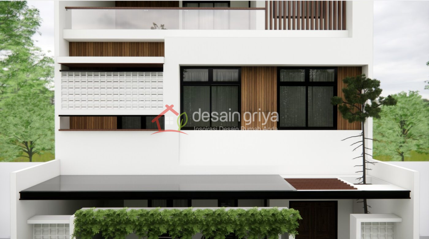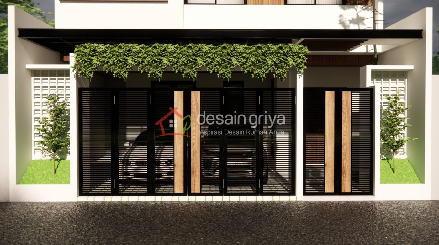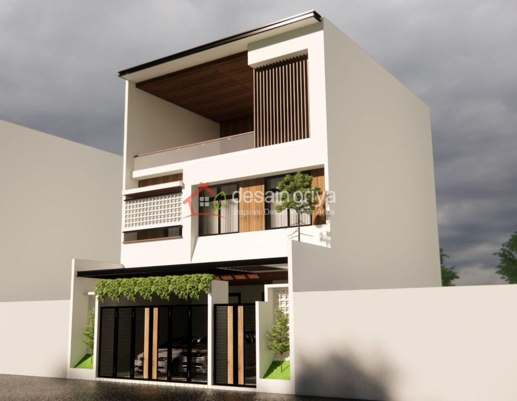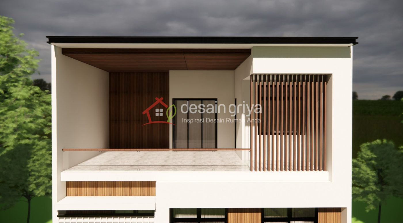 Desain Rumah berikut ini mengusung tema modern minimalis yang masih digemari dengan cirikhas garis-garis vertical dan horizontal yang tegas. Meskipun bernuansa modern minimalis tetapi unsur tropis tetap dimasukan agar rumah tetap bernuansa Indonesia seperti elemen natural warna kayu, warna coklat dan turunannya.