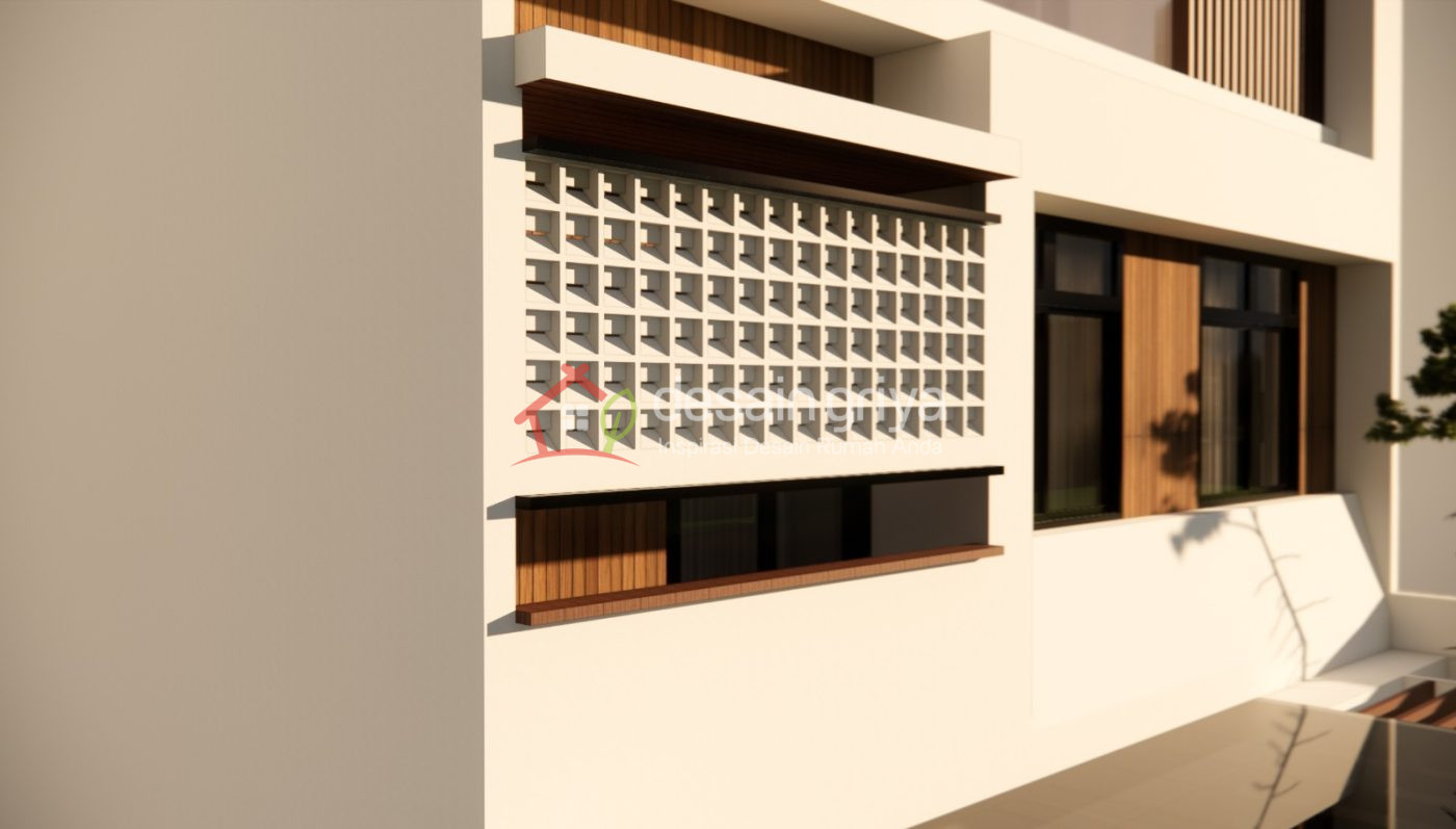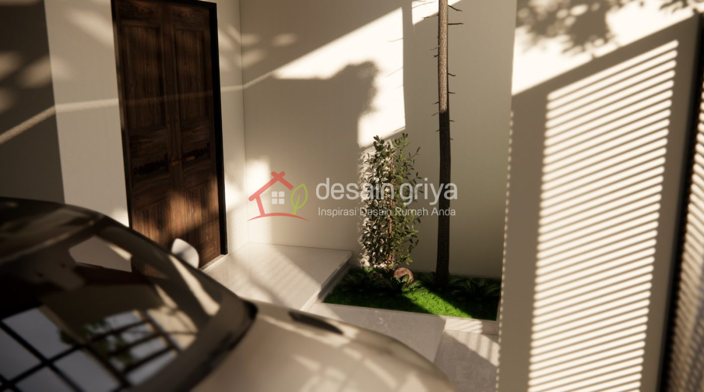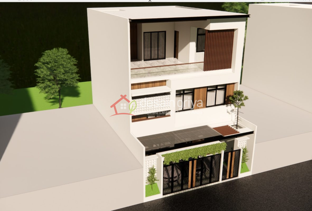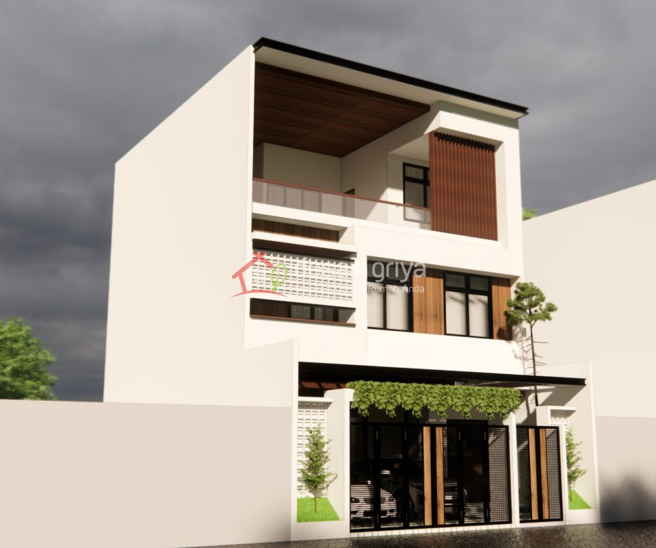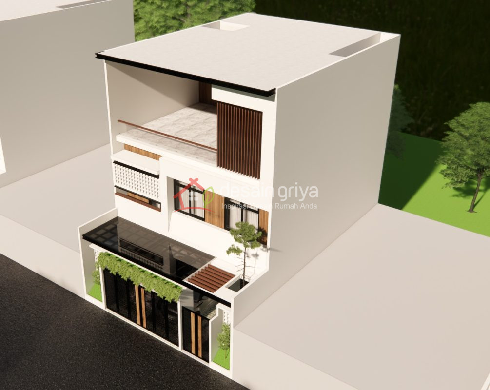 Desain Rumah berikut ini mengusung tema modern minimalis yang masih digemari dengan cirikhas garis-garis vertical dan horizontal yang tegas. Meskipun bernuansa modern minimalis tetapi unsur tropis tetap dimasukan agar rumah tetap bernuansa Indonesia seperti elemen natural warna kayu, warna coklat dan turunannya.