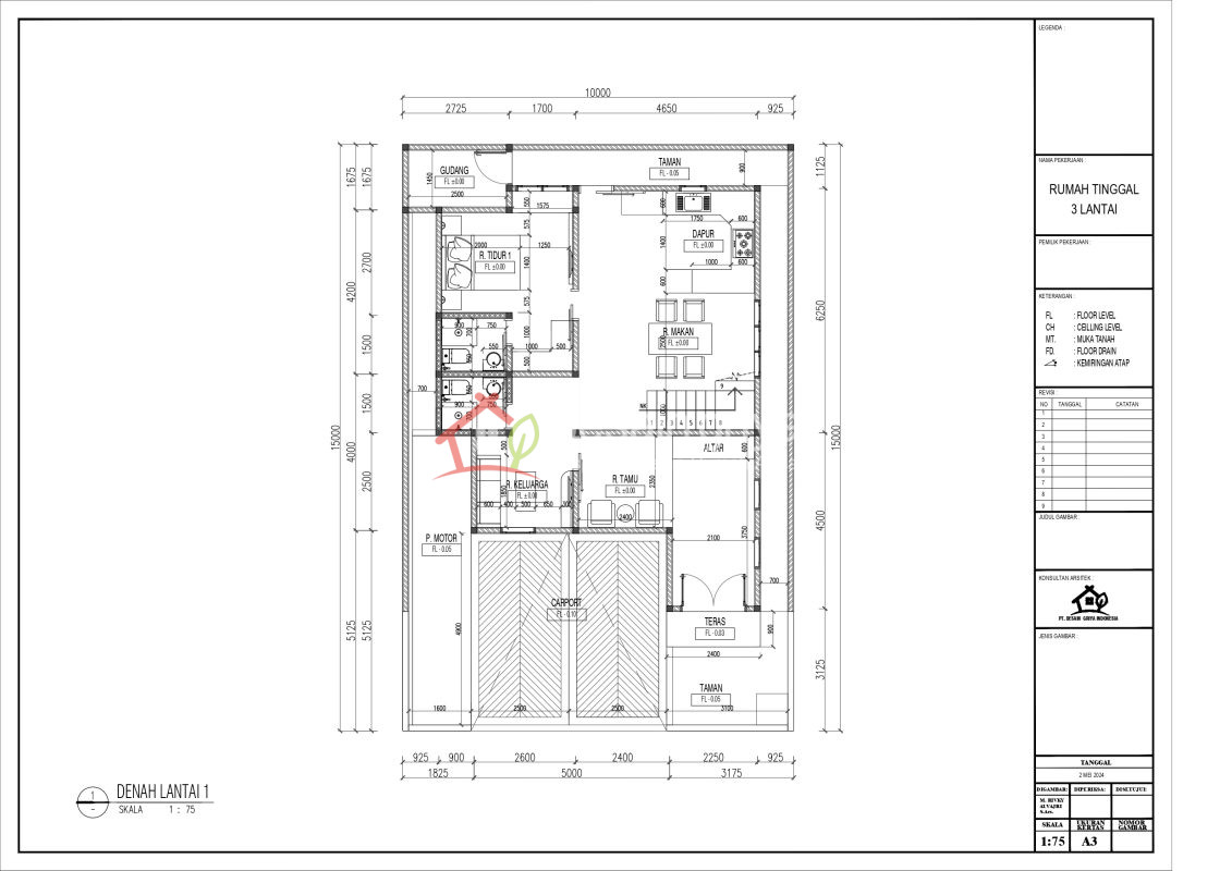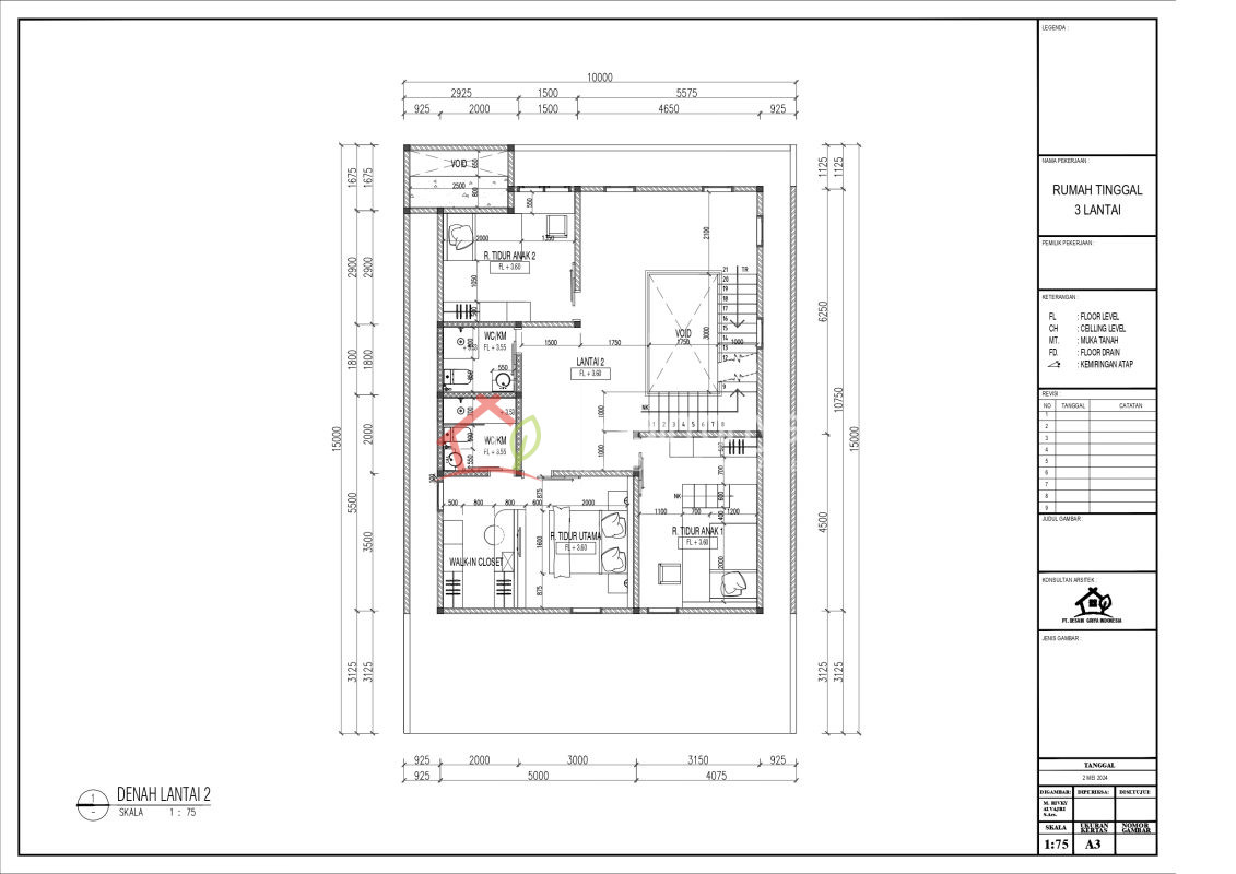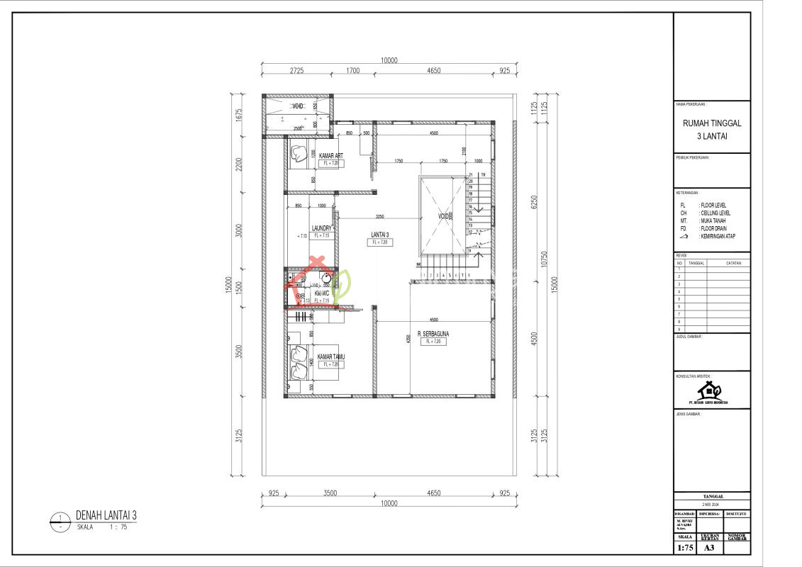 Rumah dengan lebar 10 meter dan Panjang 15 meter ini, di desain dengan kebutuhan kamar tidur utama di lantai 1 dan 3 kamar tidur anak di lantai 2.Rumah ini juga memiliki Kamar tidur tamu dan ruang serba guna di lantai 3. Sedangkan untuk rooftop masih ada ruang kerja dan area service.